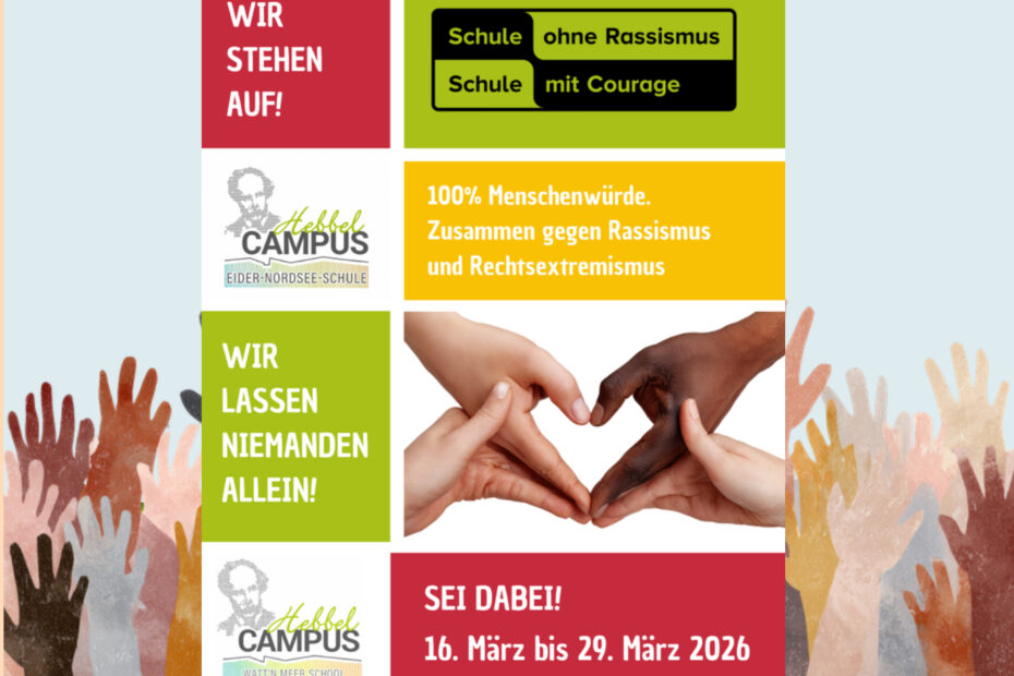 Die Eider-Nordsee-Schule befindet sich derzeit im Aufnahmeprozess in das bundesweite Netzwerk „Schule ohne Rassismus – Schule mit Courage“. Gemeinsam mit der Watt’n Meer School und… Weiterlesen »Auf dem Weg zur „Schule ohne Rassismus – Schule mit Courage“