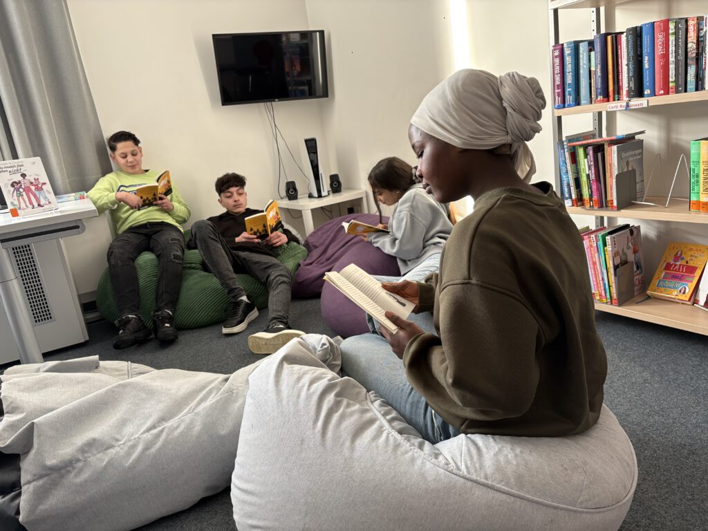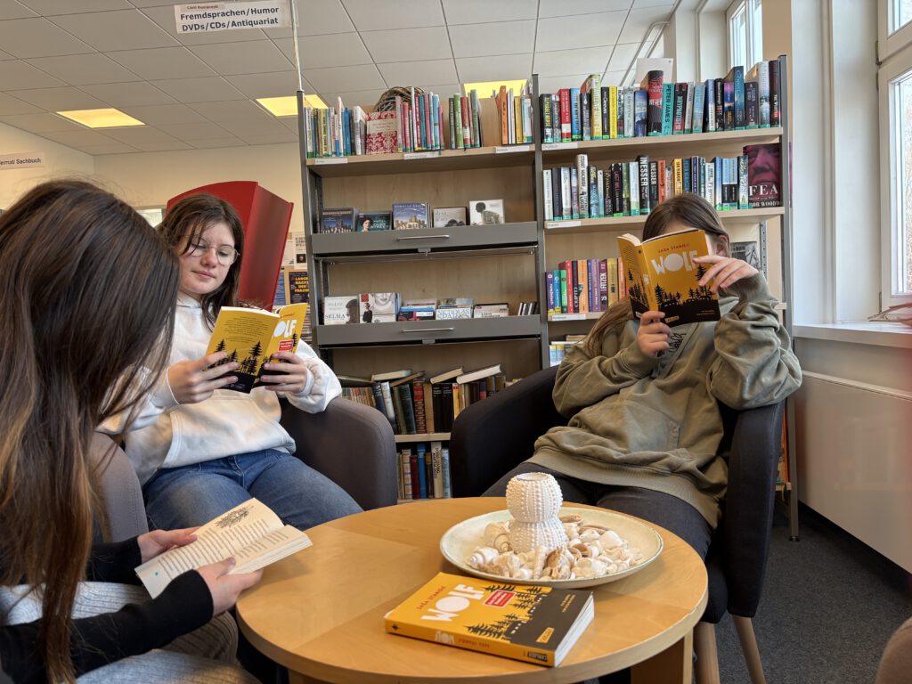 Dass sich eine öffentliche Bücherei direkt im Schulhaus befindet, ist für unsere Schülerinnen und Schüler ein großer Gewinn. Zwischen Bücherregalen, Lesesesseln und Teppichen entsteht eine ganz andere Lernatmosphäre als im Klassenraum: ruhig, gemütlich und inspirierend. Viele Kinder suchen sich einen Lieblingsplatz, lesen vertieft in ihren Büchern oder tauschen sich leise über die Geschichte aus. Gerade für die Arbeit an „Wolf“ bietet die Bücherei ideale Bedingungen. Die Schülerinnen und Schüler können sich intensiv auf die Handlung und die Figuren konzentrieren, gemeinsam Textstellen entdecken und ihre Leseerfahrungen teilen. Lesen wird hier nicht nur zur Unterrichtsaufgabe, sondern zu einem echten Erlebnis.