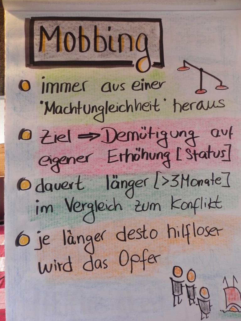 Auslachen, Schimpfwörter benutzen, Lästern, Gerüchte verbreiten, Ausgrenzen, Ignorieren, Sachen verstecken oder beschädigen und andere Schikanen, gehören in mehr oder weniger starker Ausprägung heute leider zum Schulalltag. Aber nicht jedes Schimpfwort, jeder Streit, oder jede körperliche Auseinandersetzung ist Mobbing. Sehr viele Schüler*innen besitzen Smartphones und haben Zugang zum Internet. Die digitale und die reale Welt sind eng miteinander verbunden. Daher sind Mobbing und Cybermobbing meistens nicht voneinander zu trennen. Über den Weg des Internets bestehen weniger Hemmungen, andere Personen durch Beleidigungen, Belästigungen, Bloßstellen, Bedrohungen, bis hin zur Gründung von Hassgruppen, z.B. über Whats-App. Mobbing in der Schule wird häufig online weitergeführt. Oder es startet im digitalen Raum und wird in der Schule fortgesetzt. Absichtliche Verletzungen sind Formen der Gewalt. Allerdings werden sie erst dann zu Mobbing, wenn sie wiederholt und systematisch auftreten, die Betroffenen sich nicht wehren können und es der Machtausübung Einzelner in der Klasse dient.