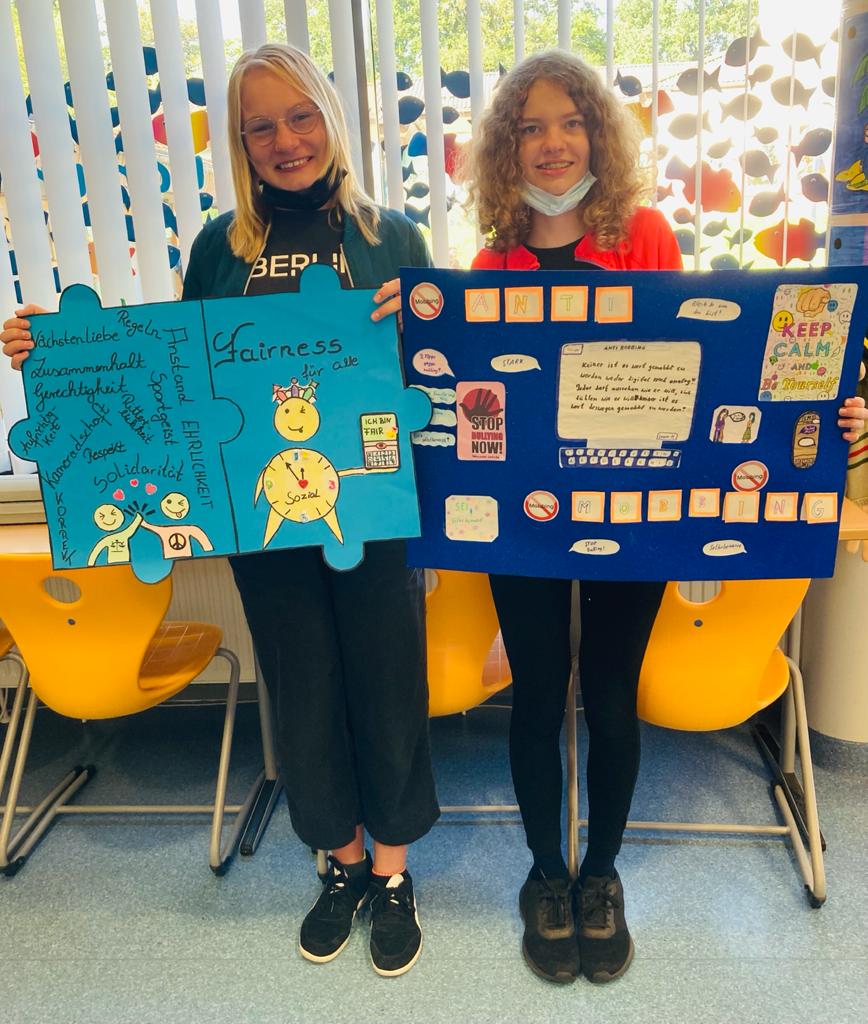 Ida Karstens und Laura Hansen (beide 7e) präsentieren ihre Anti-Mobbing-Plakate (Schuljahr 2021/2022)