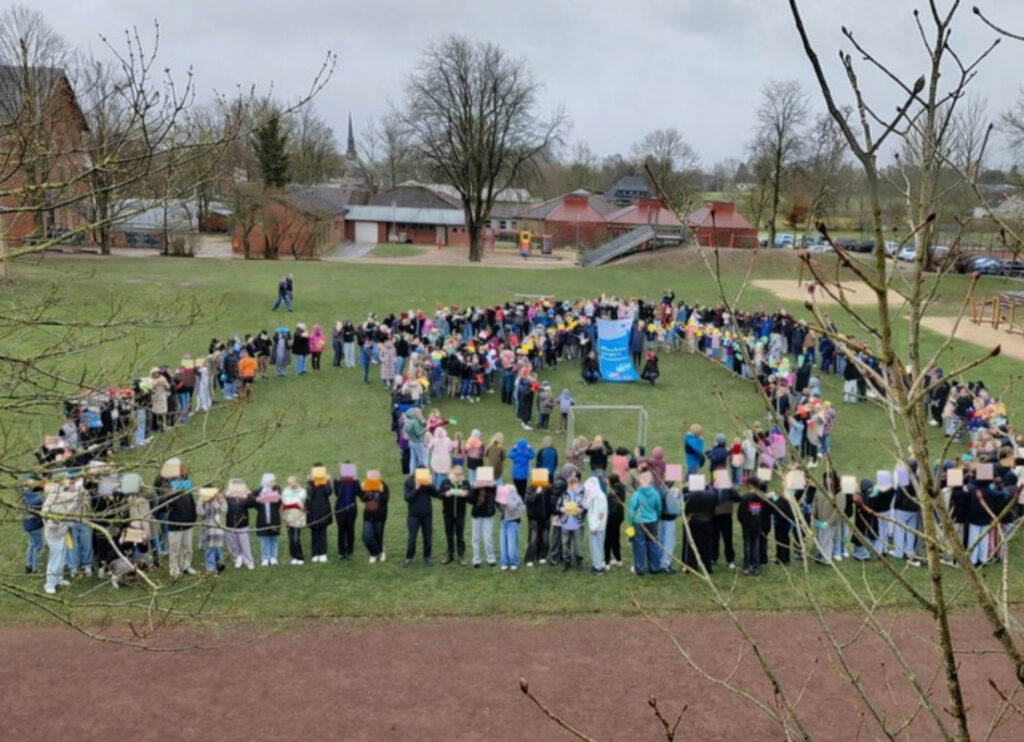 Im Anschluss setzten die Hennstedter Schulen ein sichtbares Zeichen nach außen: Auf einer Wiese formten alle gemeinsam eine Menschenkette – ein starkes Symbol für Zusammenhalt und Solidarität.