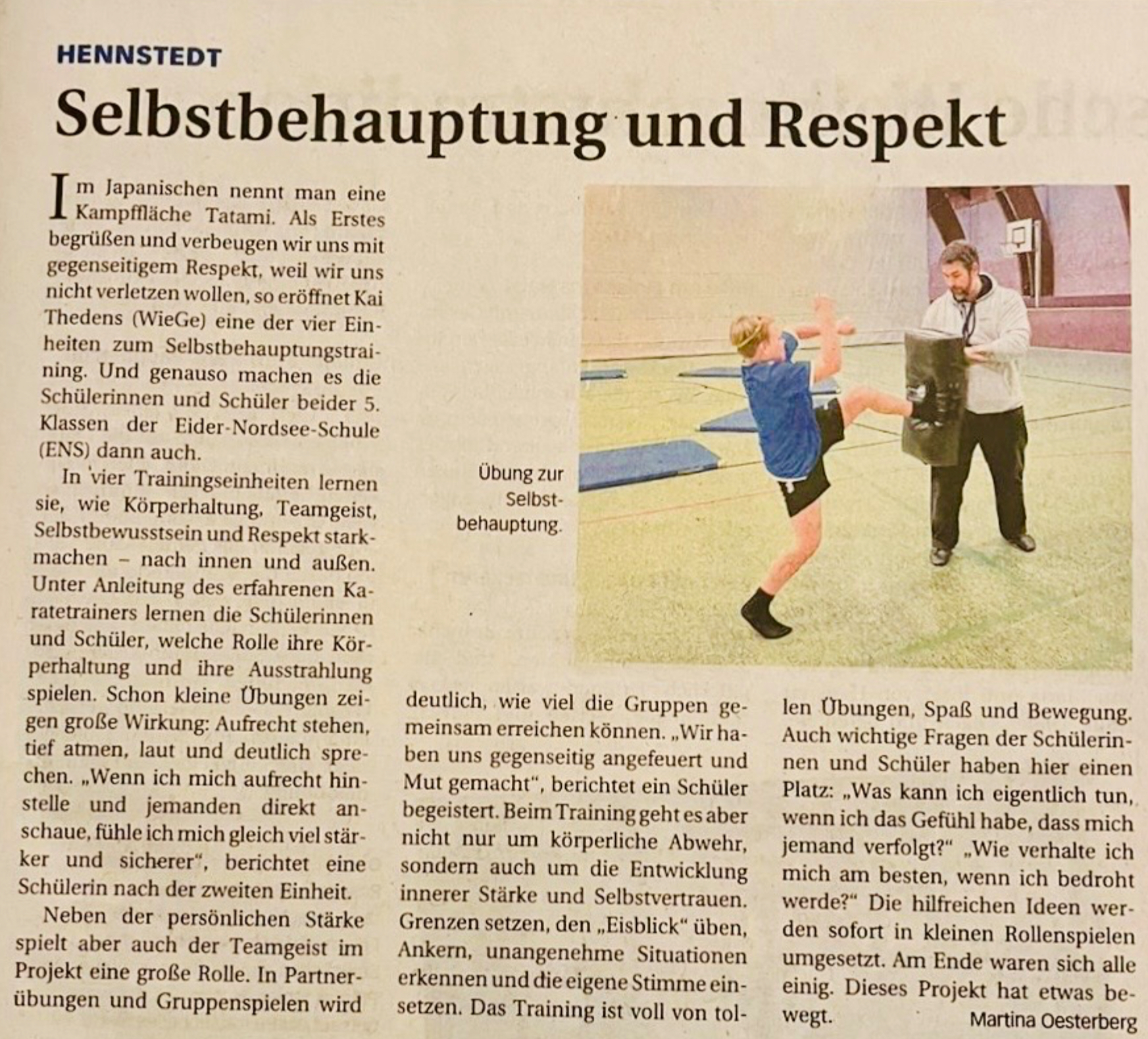 „Im Japanischen nennt man eine Kampffläche Tatami. Als Erstes begrüßen und verbeugen wir uns mit gegenseitigem Respekt, weil wir uns nicht verletzen wollen“, so eröffnet Kai Thedens (WieGe) eine der vier Einheiten zum Selbstbehauptungstraining. Und genauso machen es die Schülerinnen und Schüler beider 5. Klassen der Eider-Nordsee-Schule (ENS) dann auch.